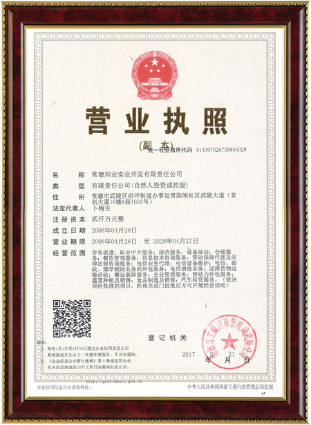 常德邦業(yè)實(shí)業(yè)開發(fā)有限責(zé)任公司(原名常德市邦業(yè)人力資源開發(fā)有限責(zé)任公司)是經(jīng)湖南省人力資源和社會(huì)保障廳核準(zhǔn)備案,常德市人力資源和社會(huì)保障局批準(zhǔn),常德市工商行政管理局登記注冊(cè)的一家綜合性人力資源服務(wù)型企業(yè)。公司成立于2008年4月28日,注冊(cè)資本2000萬元。